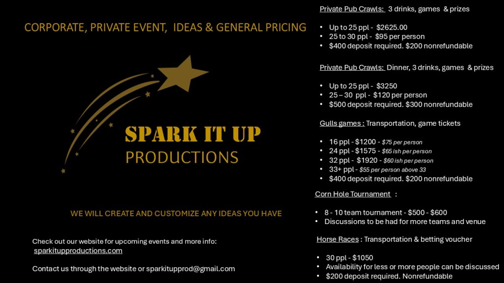 These are just some examples of events we have provided. Please note, we are not limited to these ideas. Let’s collaborate and build whatever experience your group is looking for!! **Pricing will vary depending on how many stops and venues we stop at**